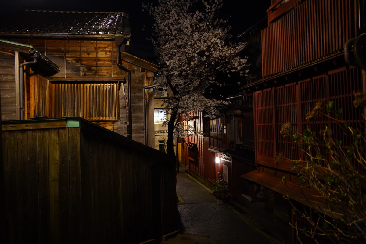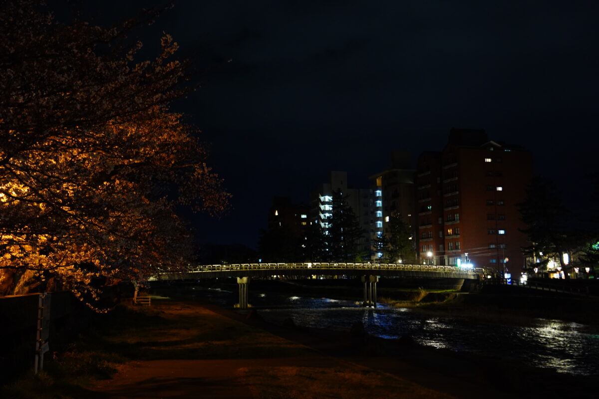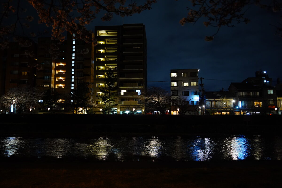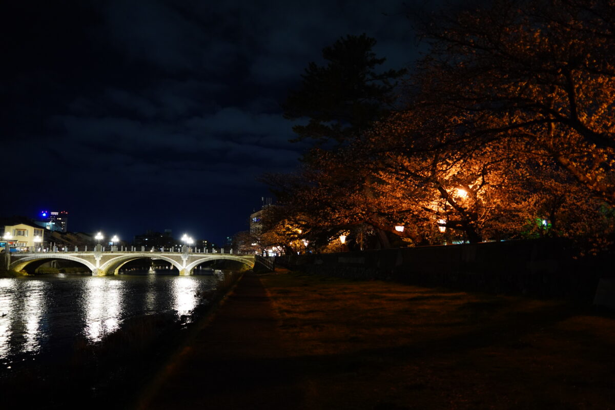 浅野川沿いの遊歩道は桜の木でいっぱいで、ちょうどいい咲き心地。灯籠の光がいい雰囲気だし、人通りがほぼなくて最高過ぎました……!!!!!
