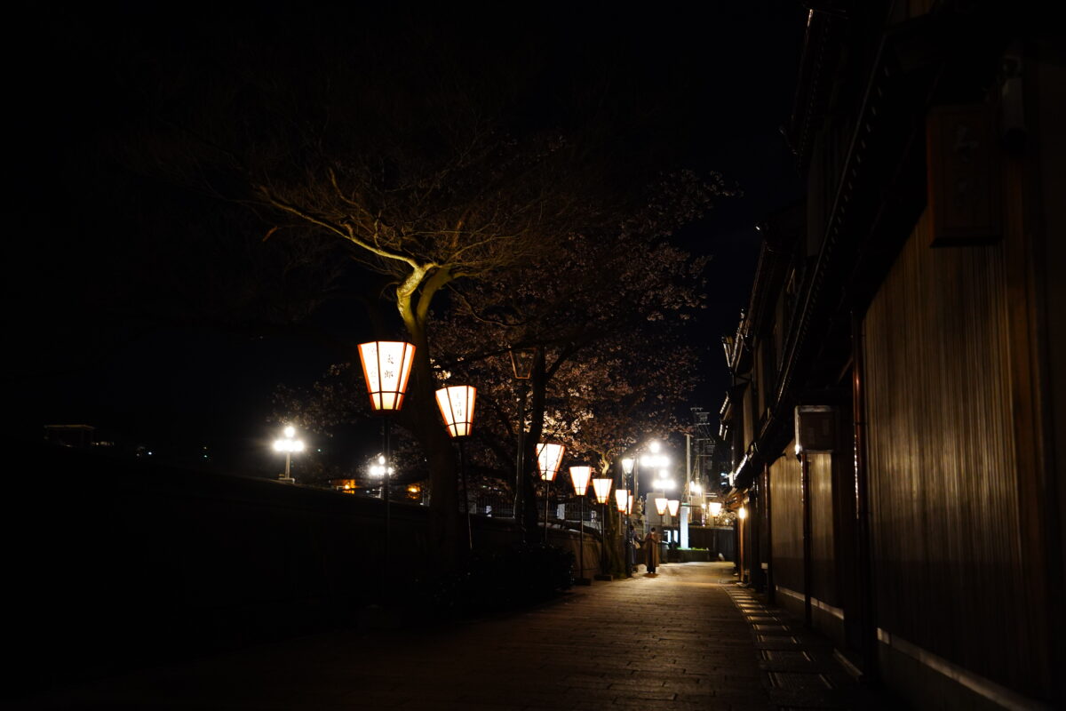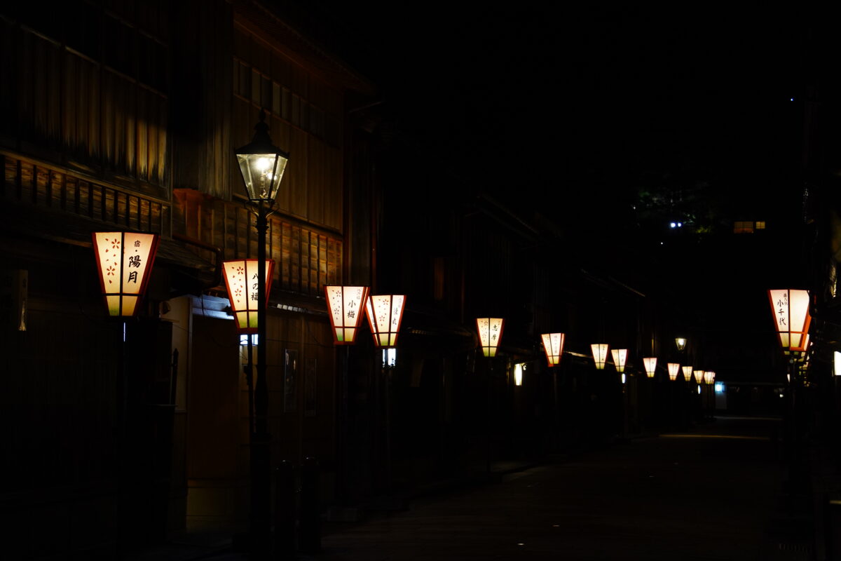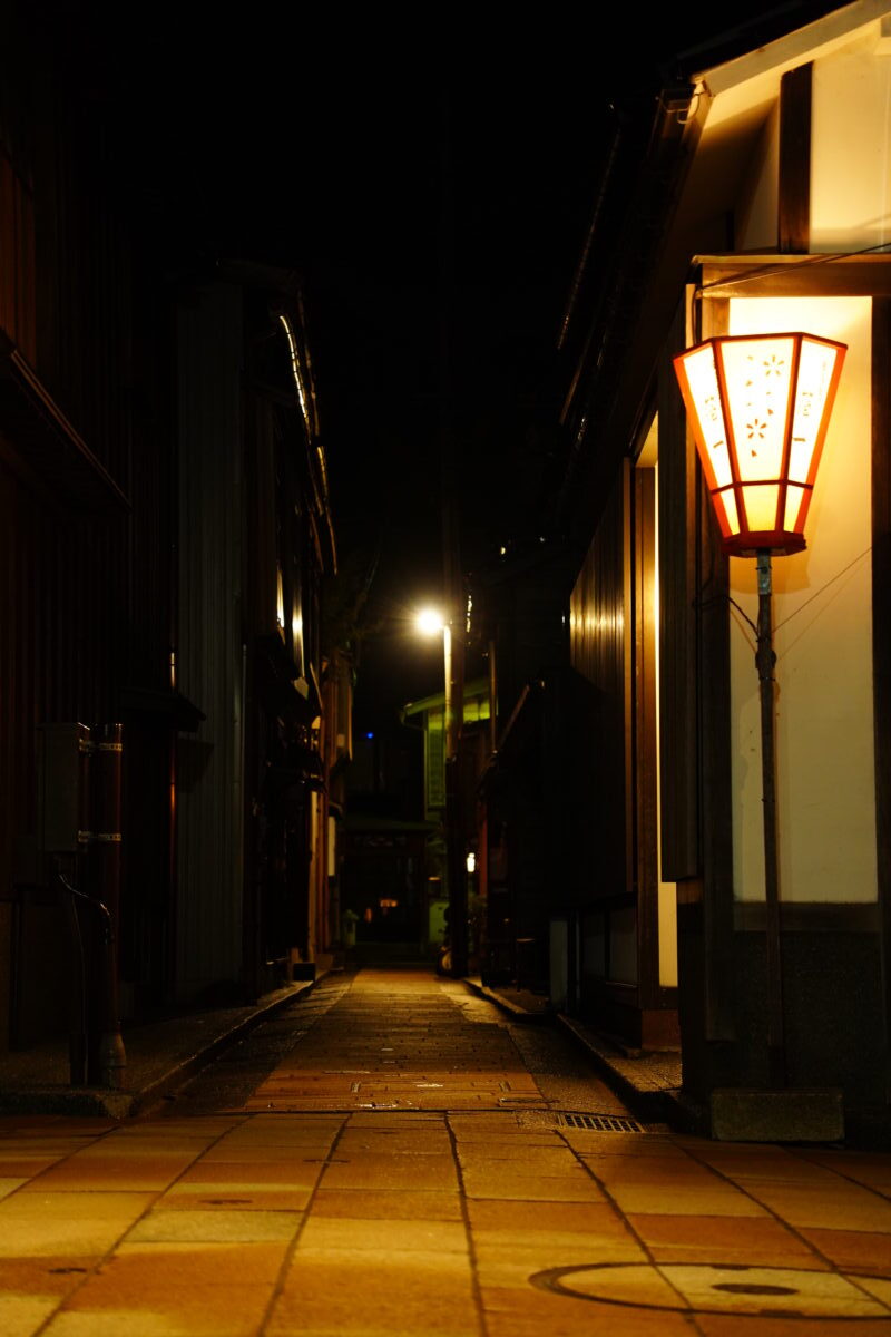 昔ながらの街並みが残るひがし茶屋街。整然とした道路に灯籠が並んでいて、いい感じの漆黒具合でとても綺麗でした……!雰囲気が最高。