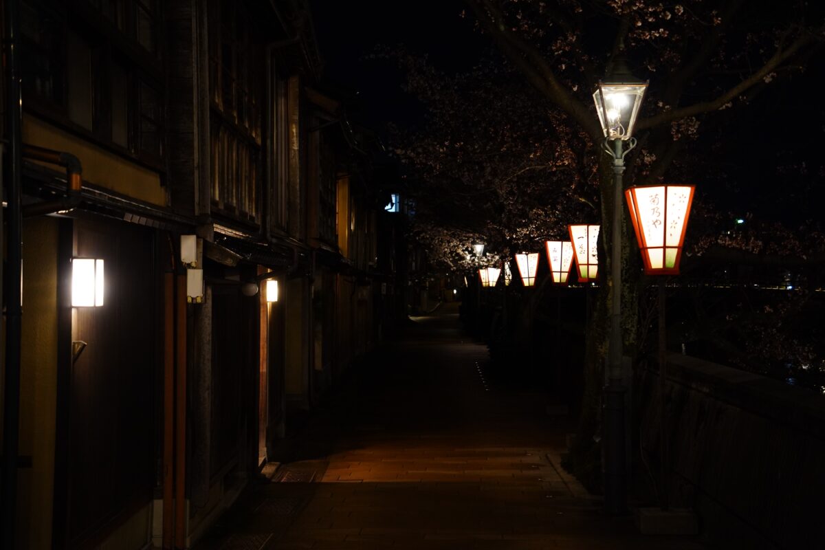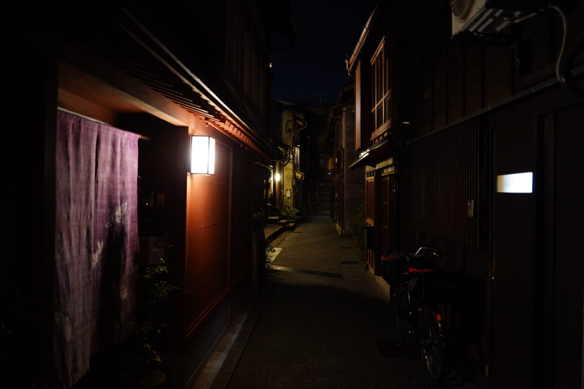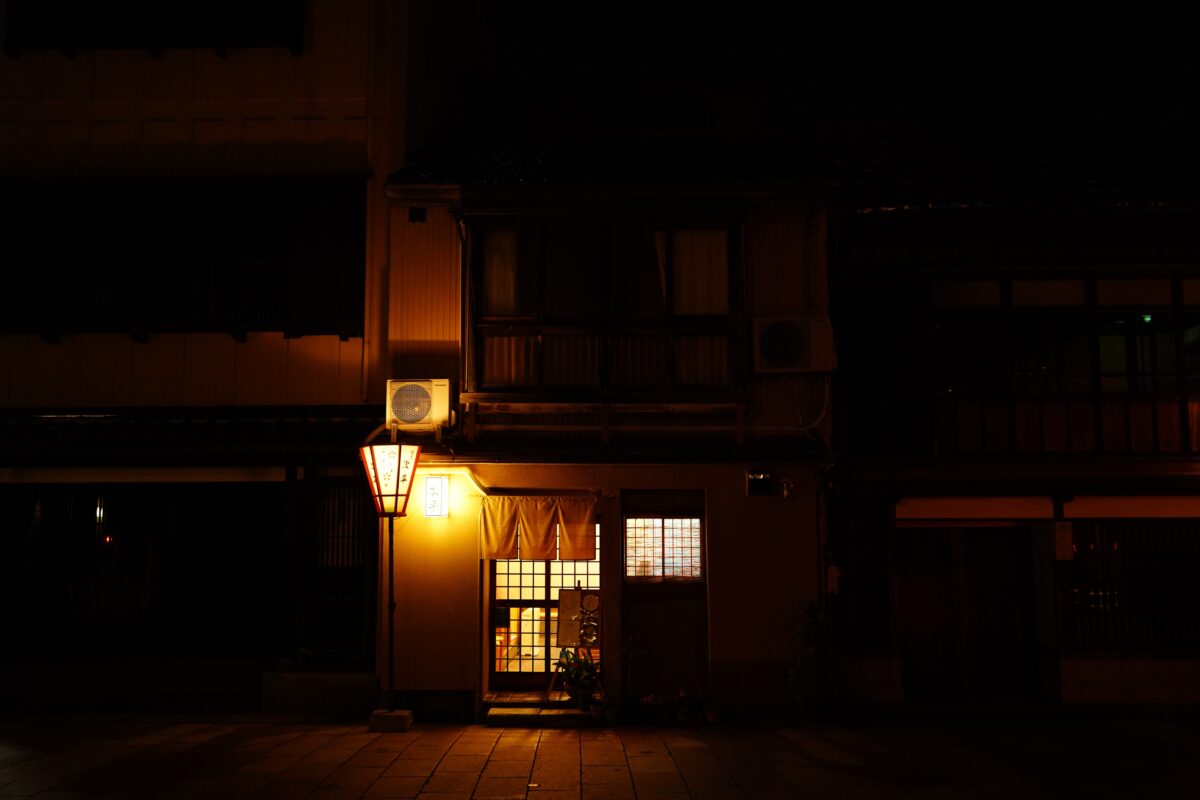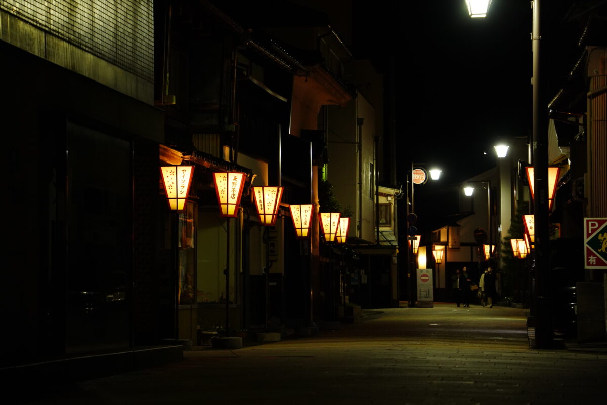 昔ながらの街並みが残るひがし茶屋街。整然とした道路に灯籠が並んでいて、いい感じの漆黒具合でとても綺麗でした……!雰囲気が最高。