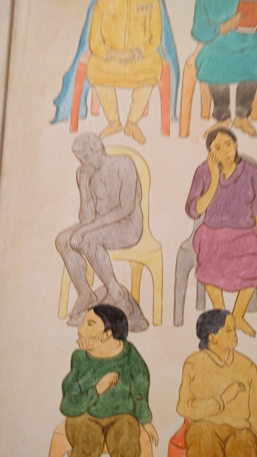 まず、彼の作品は見ていて飽きないんですよ!例えば人間が数百人と描かれた巨大な絵が何点かあるのですが、その一人ひとりを見ているとあっという間に時間が過ぎていきます。表情とか特徴が一人ひとり違うので。しかも、ハルシャの遊び心でバットマンが隠れていたり、隠し絵などがあるんです。